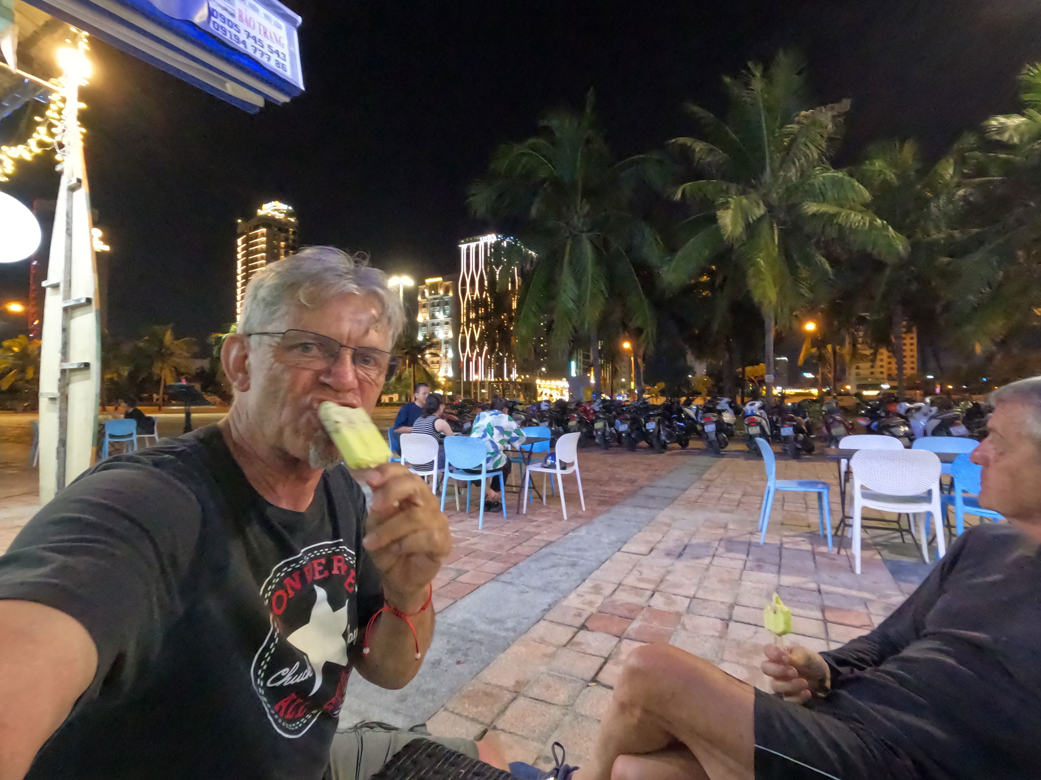 Ensuite nous allons manger une glace et flânons un peu sur la plage. Ce n’est possible que le soir car dans la journée le soleil te crame la peau. L’indice UV est à son maximum ici !