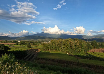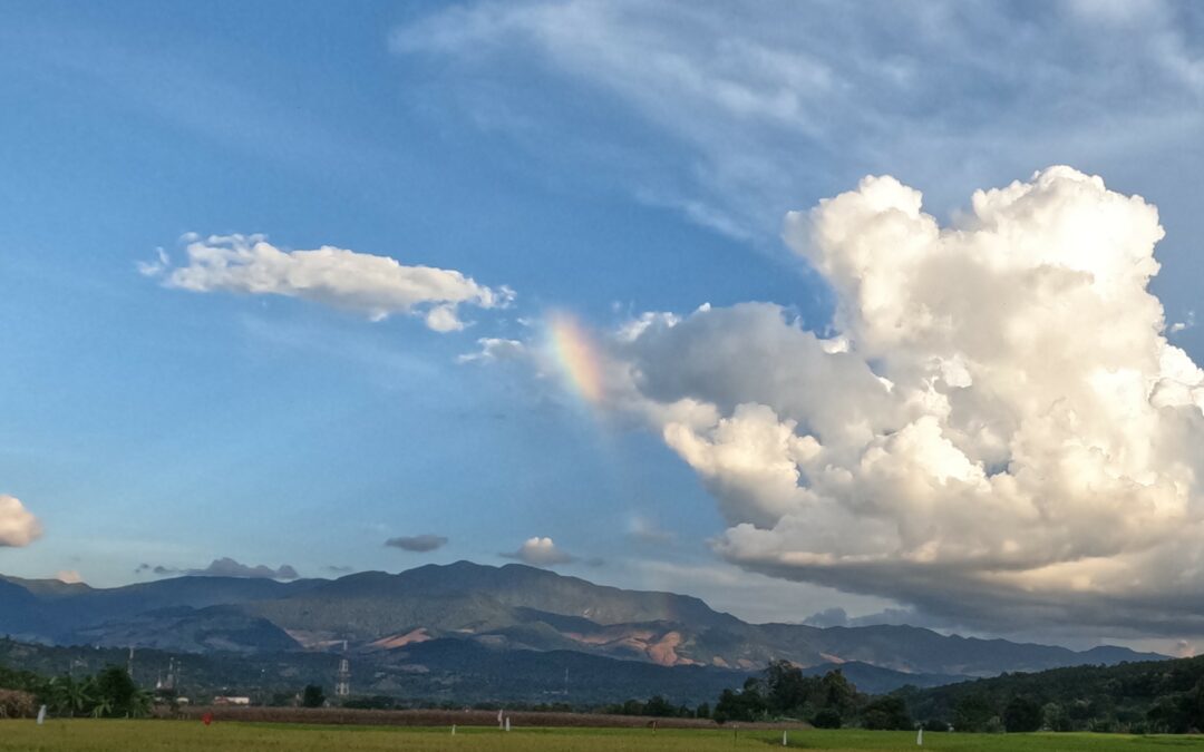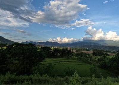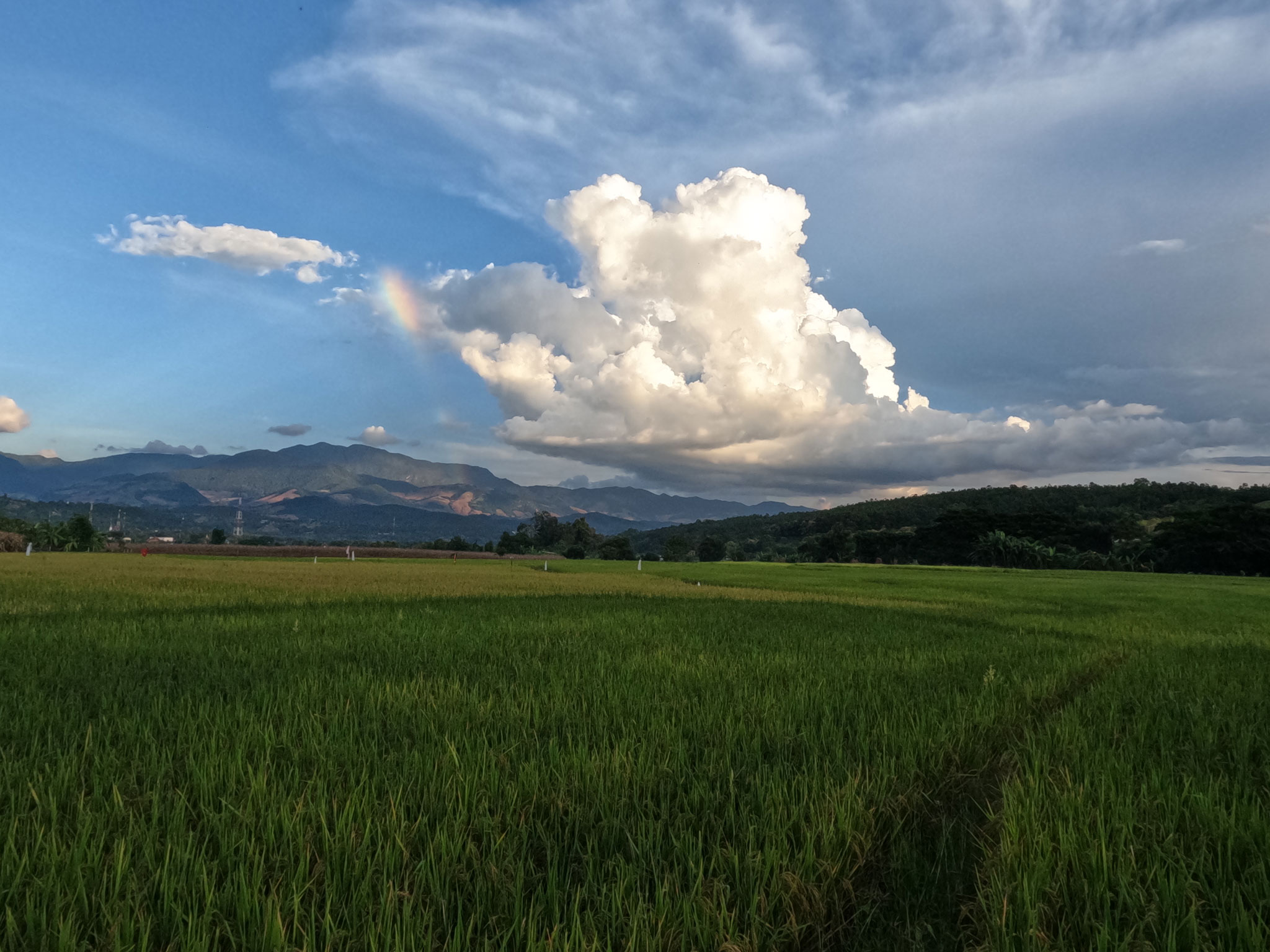 Arrivés à l’hôtel, nous nous posons un peu puis repartons pour admirer le coucher du soleil sur les montagnes et en prime nous avons eu droit à un petit bout d’arc-en-ciel sur un gros nuage.