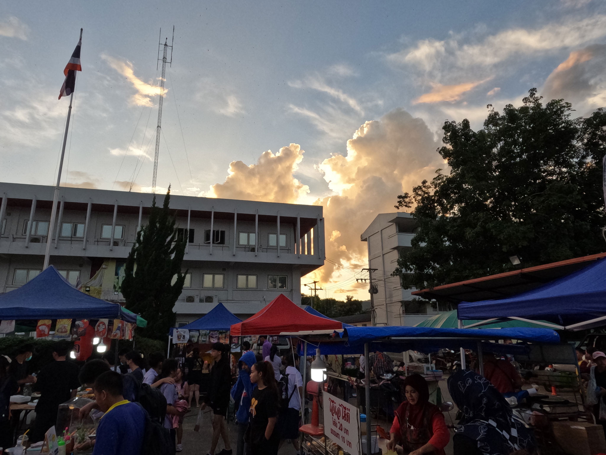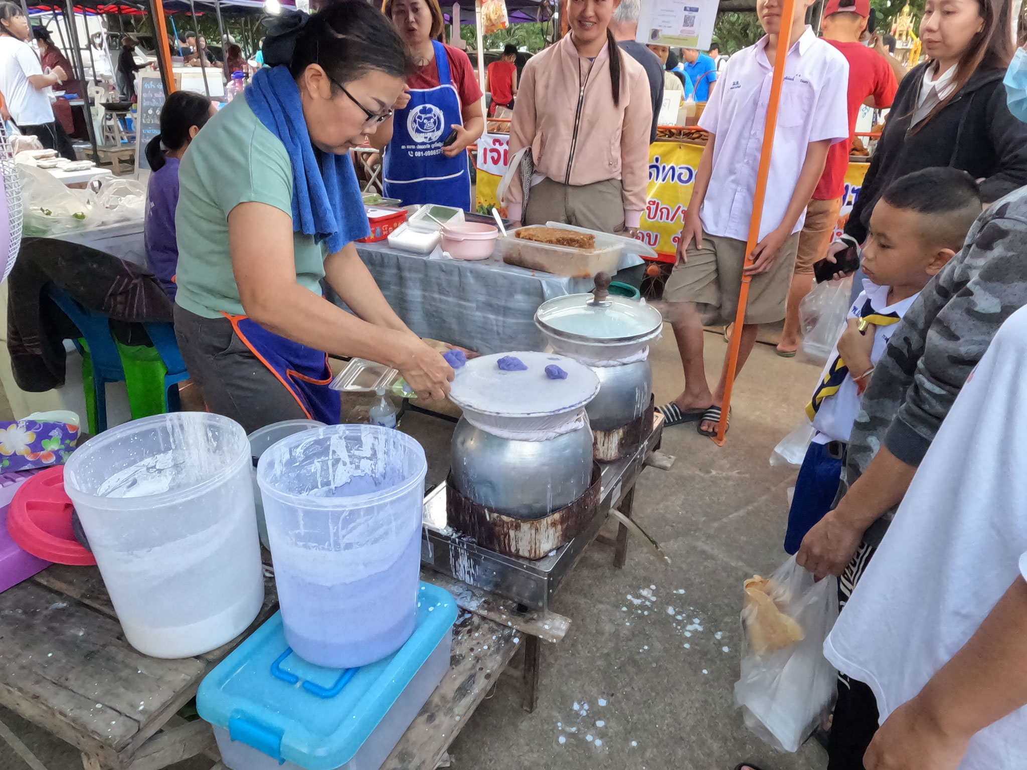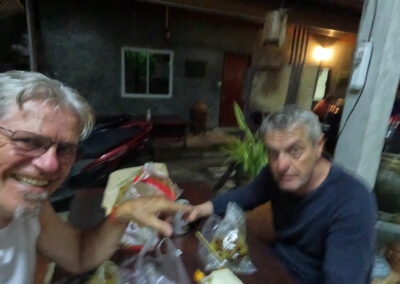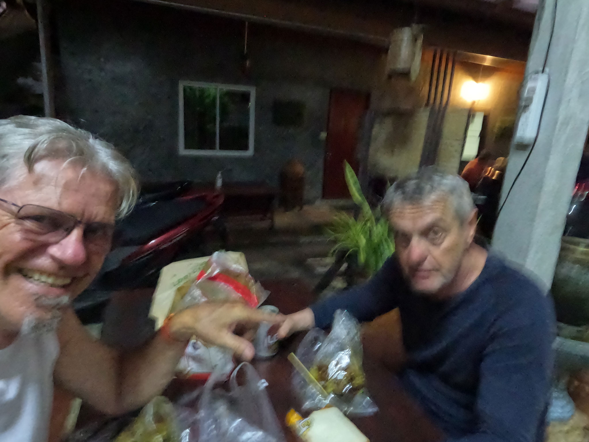 De retour à la ville, nous nous arrêtons sur un petit marché pour acheter notre diner. Nous prenons de la saucisse de “Toulouse à la Thaïlandaise”. Pauvre Gilles, à la cinquième bouchées il a la bouche en feu, les yeux en pleurs et le nez qui coule !