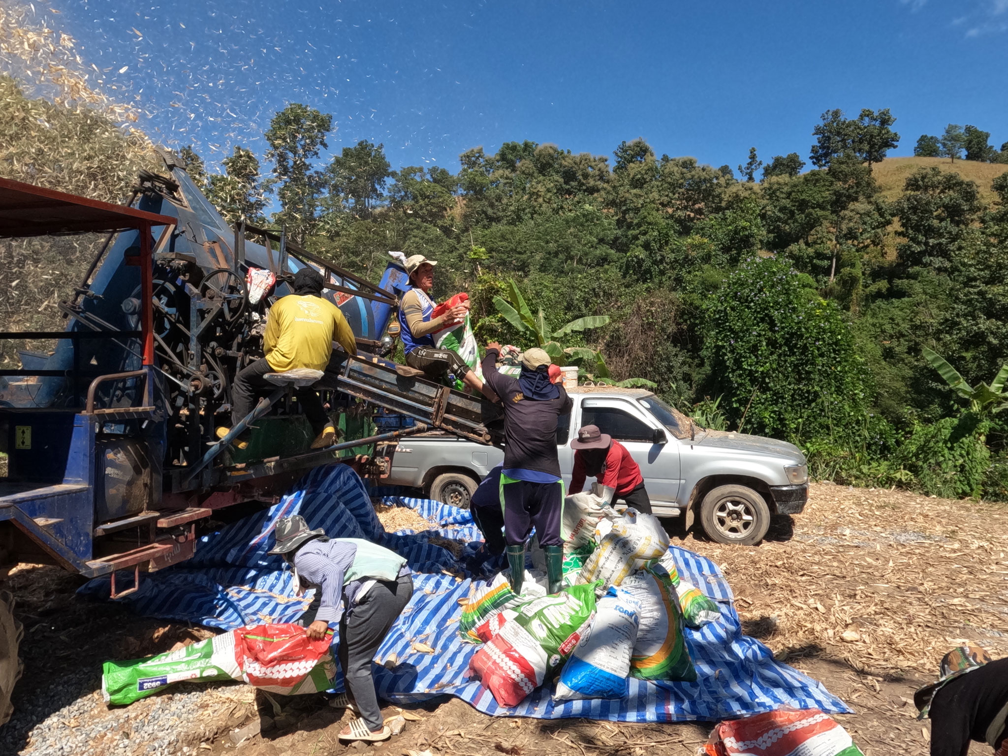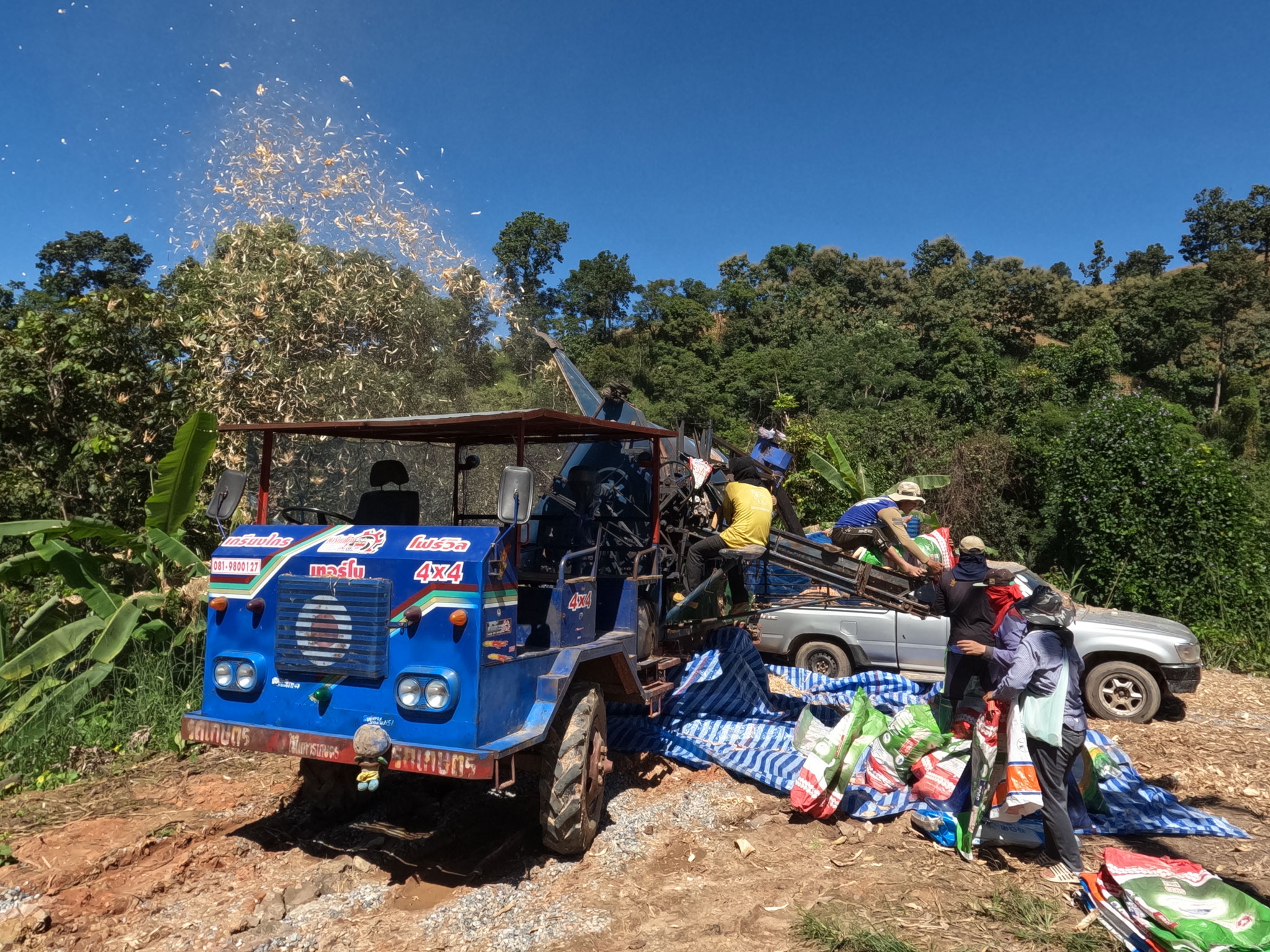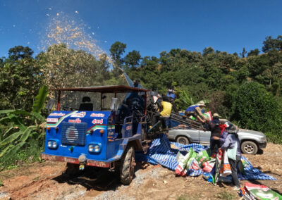 Sur le chemin du retour, nous nous arrêtons pour regarder des paysans qui, à l’aide d’une machine bruyante, retirent l’enveloppe qui recouvre les épis de maïs.
