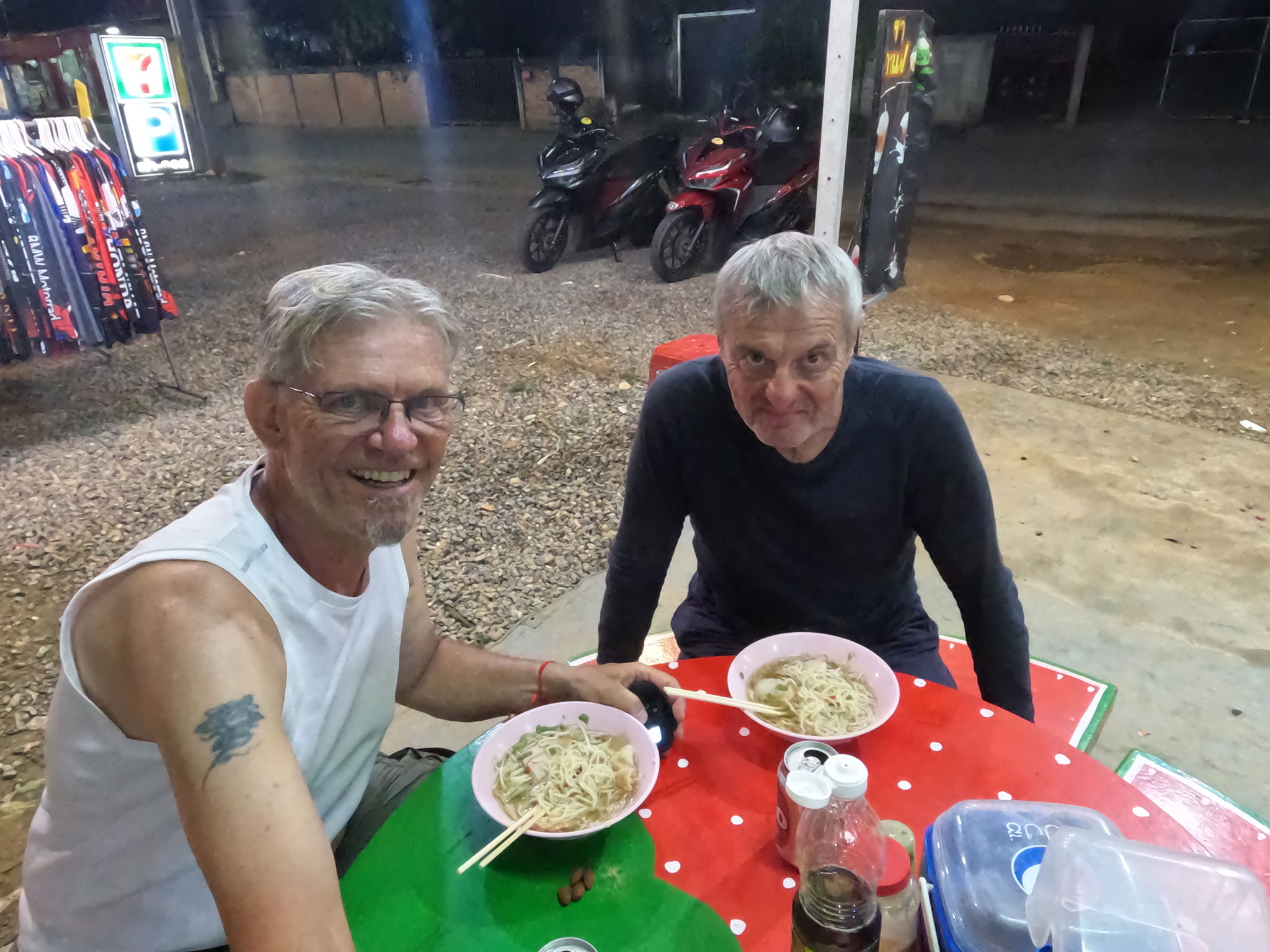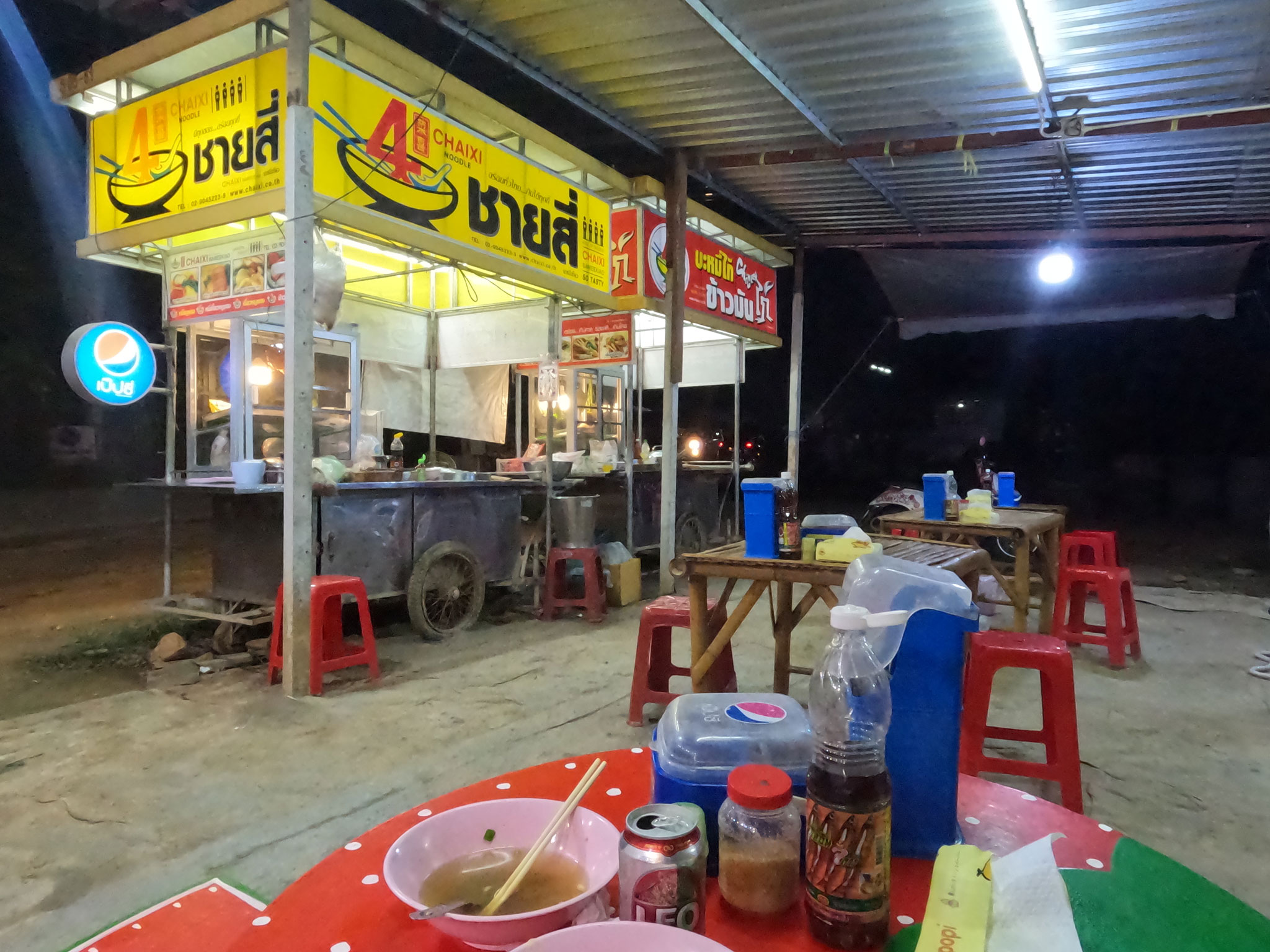 Retour à Maé Chaem pour diner dans un petit restaurant de bord de route à côté d’un “7Eleven” où nous avons pu acheter deux bières bien fraiches !
