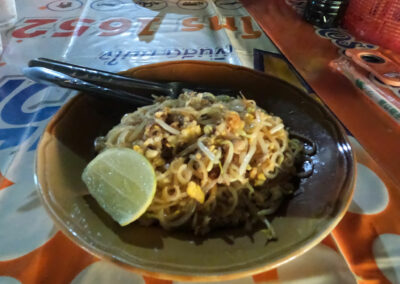 Après une bonne douche salvatrice et une petite heure de détente dans notre joli bungalow climatisé, nous sommes partis à la recherche d’un endroit pour diner et nous avons trouvé “notre petite cantine” où nous avons pu déguster un excellent Pad Thaï.