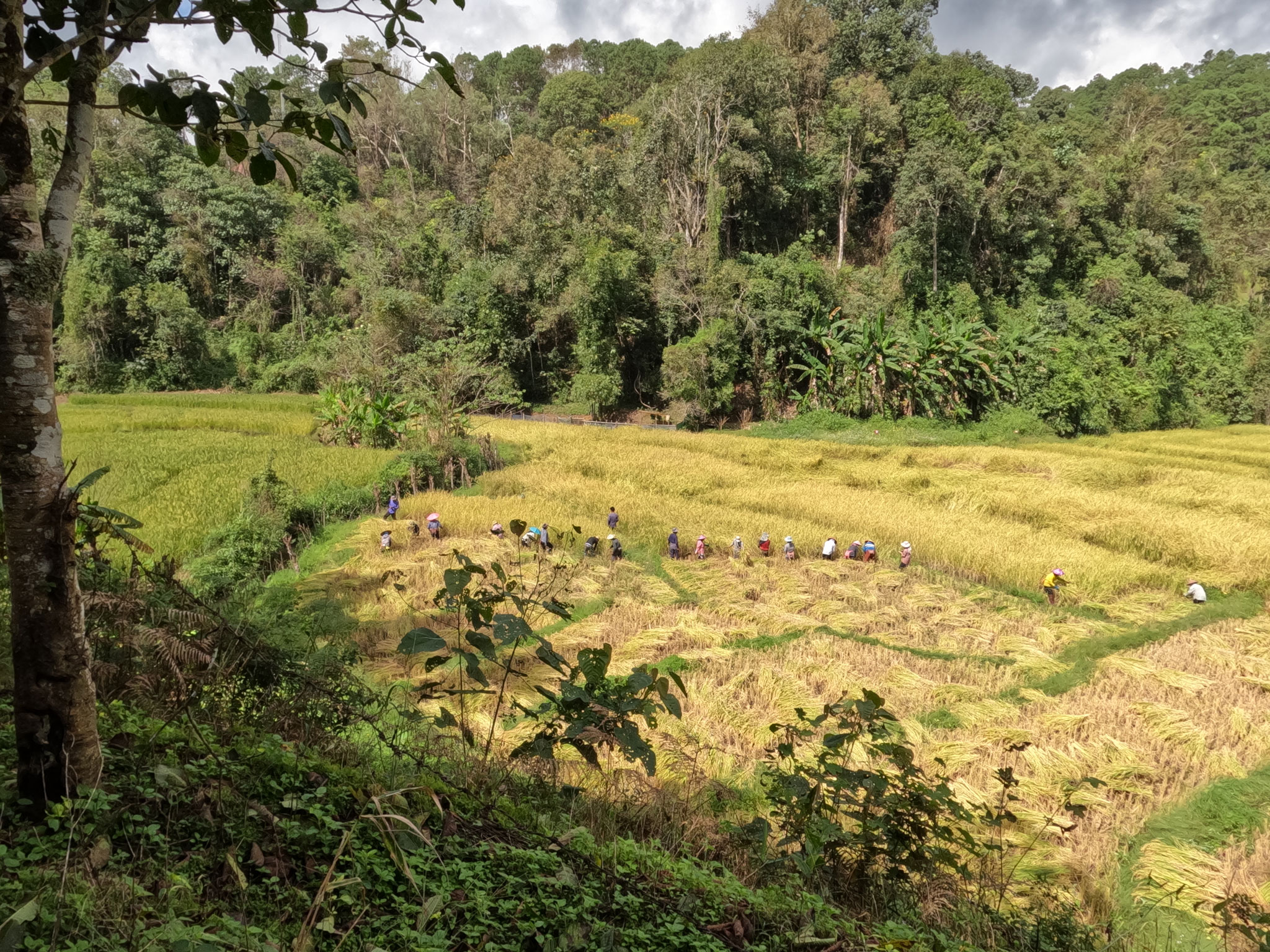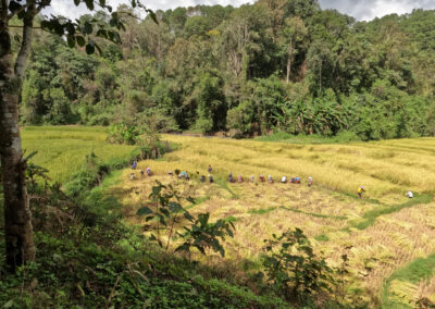 Toujours sur la route en allant vers le village chinois, nous nous arrêtons successivement pour voir des cueilleuses de thé à l’ouvrage et au retour le fauchage du riz à la main.