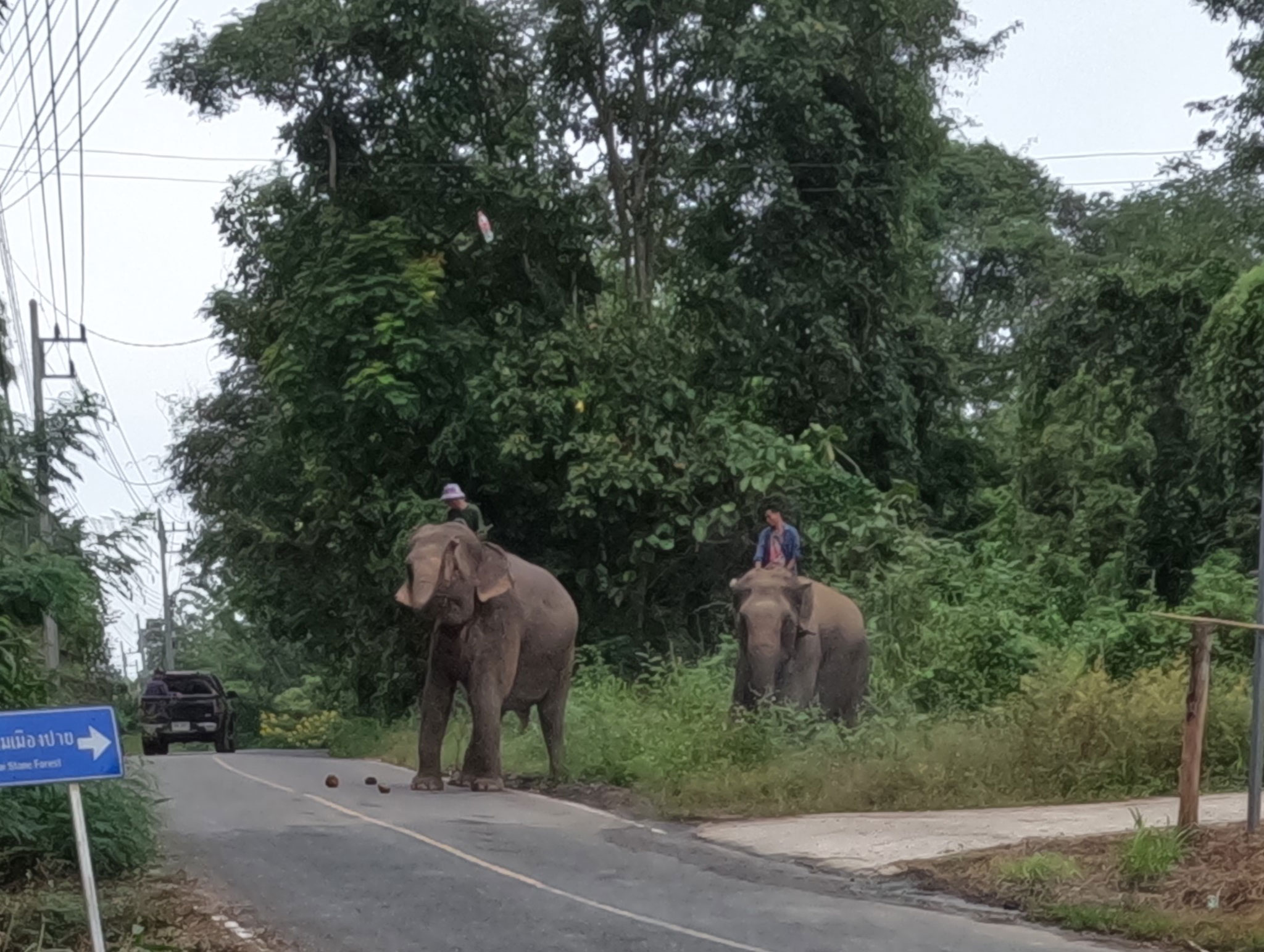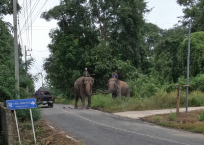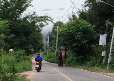 Sur la route nous croisons des éléphants. Le plus gros, sûrement le mâle, n’est pas content de nous voir. Il barrit méchamment et s’avance vers nous malgré les efforts de son cornac pour l’obliger à faire demi-tour. Gaaazzz ! Ne restons pas là !
