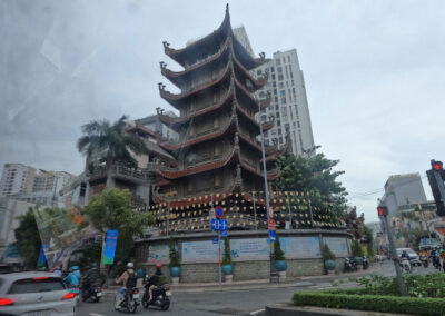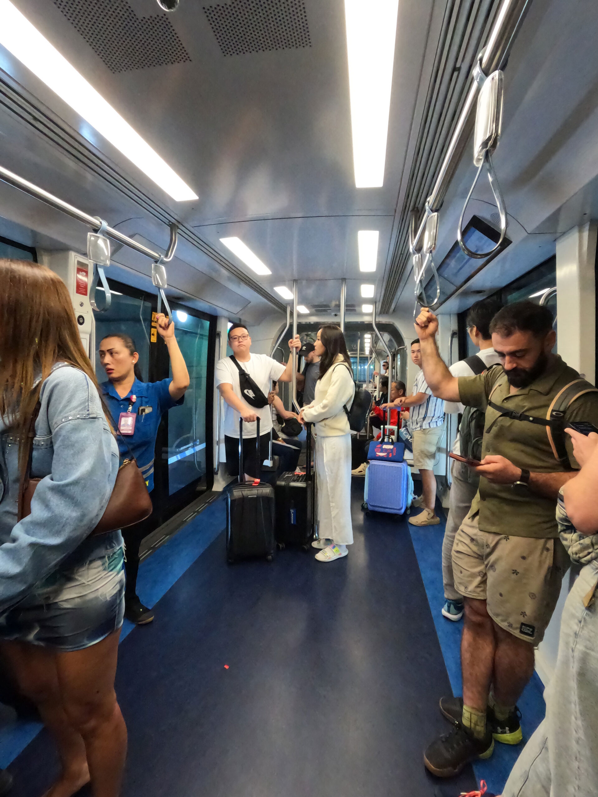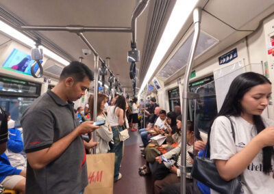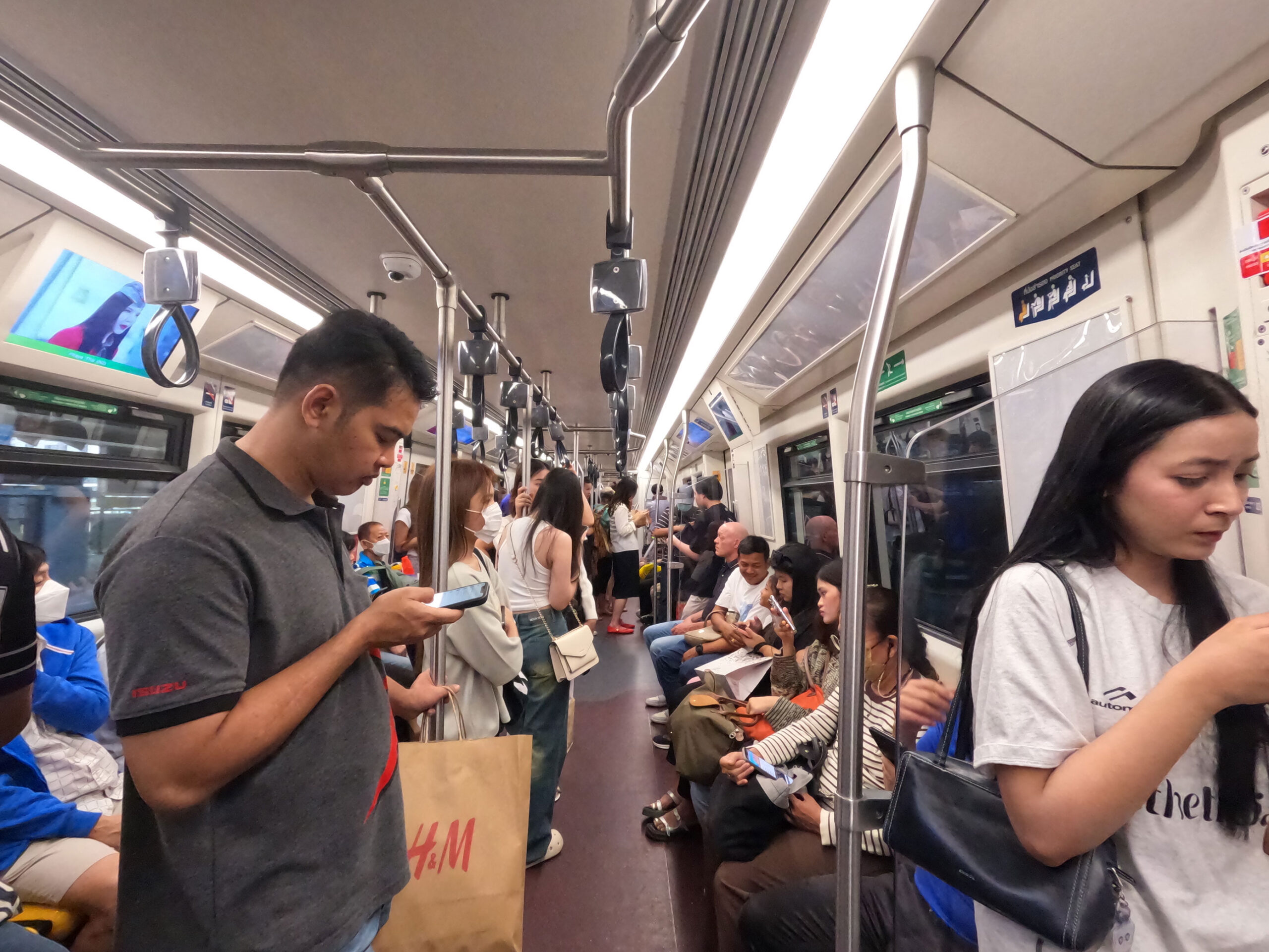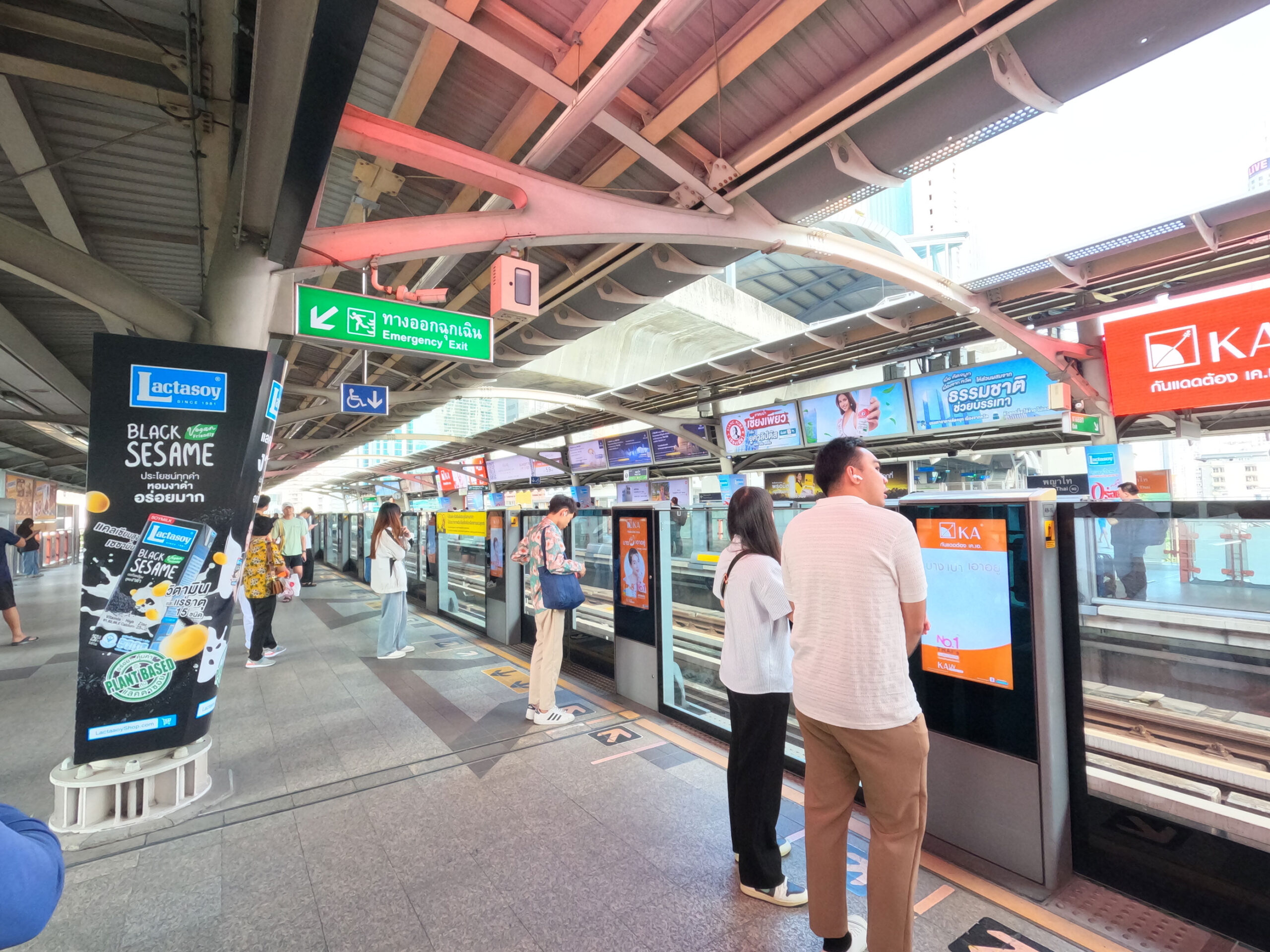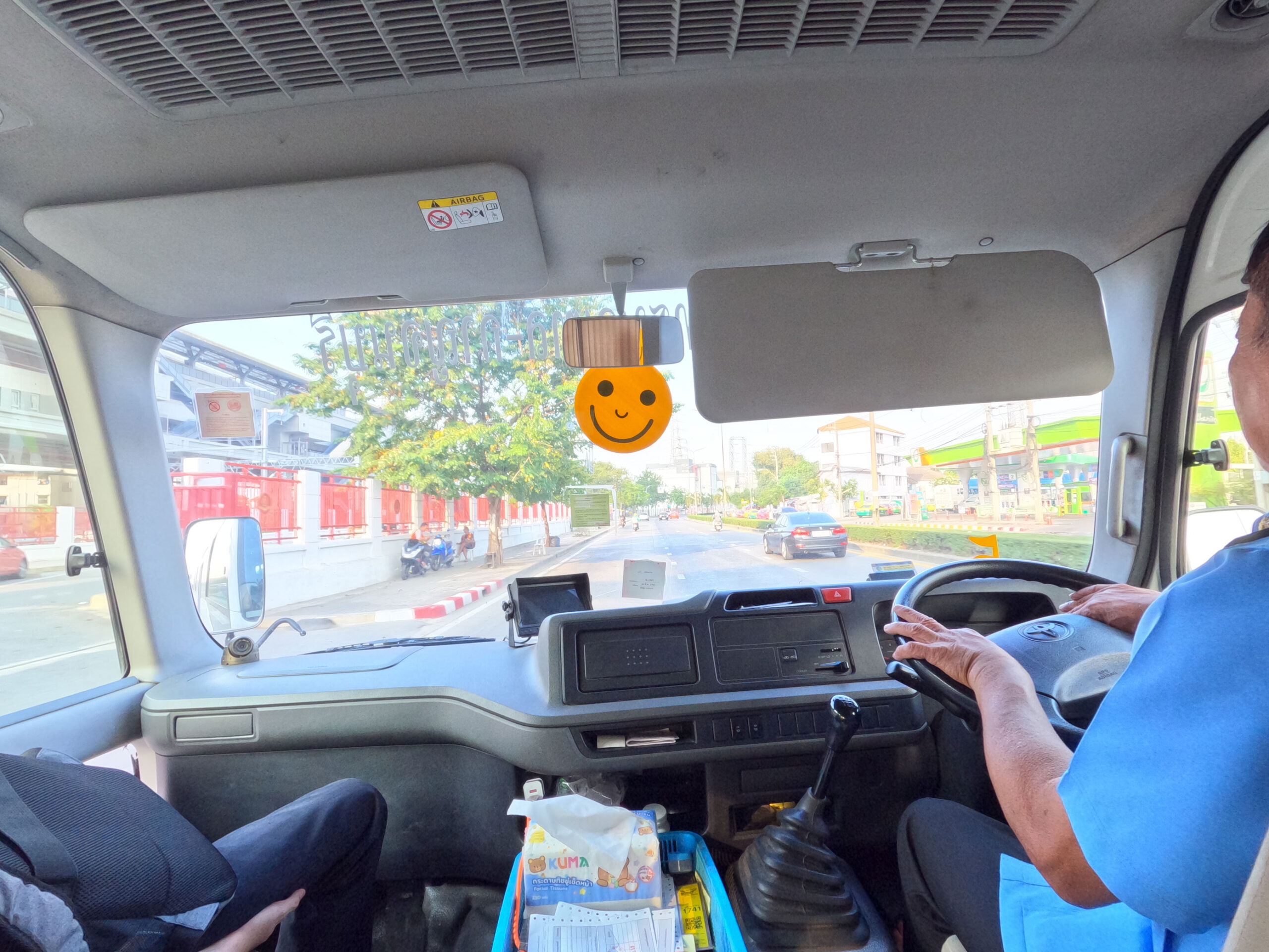 A la sortie de l’aéroport, nous montons dans la navette aérienne qui relie l’aéroport de Bangkok au métro dans le centre ville. Sortis du métro nous prenons un taxi qui nous transporte vers la gare routière d’où partent les bus pour Kanchanaburi.