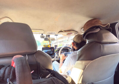 Nous prenons un taxi pour nous rendre à l’aéroport.
